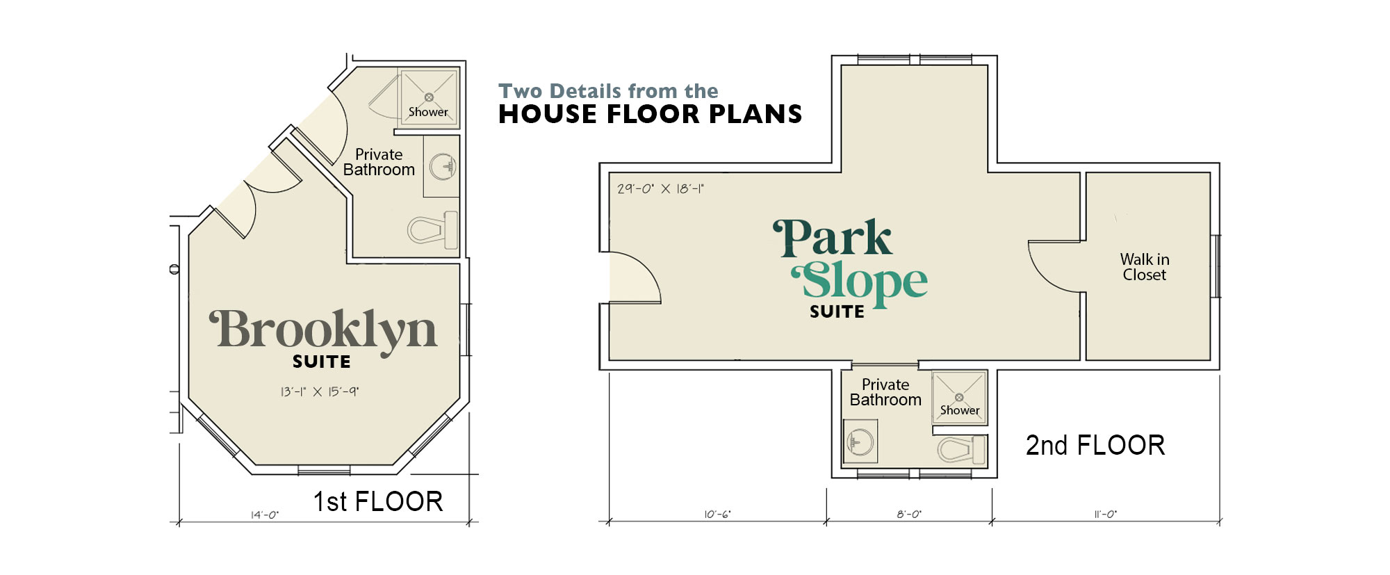 The 1st floor interior includes the Brooklyn Suite with a full private bathroom. The 2nd floor interior includes the Park Slope Suite which contains a full ensuite private bathroom.