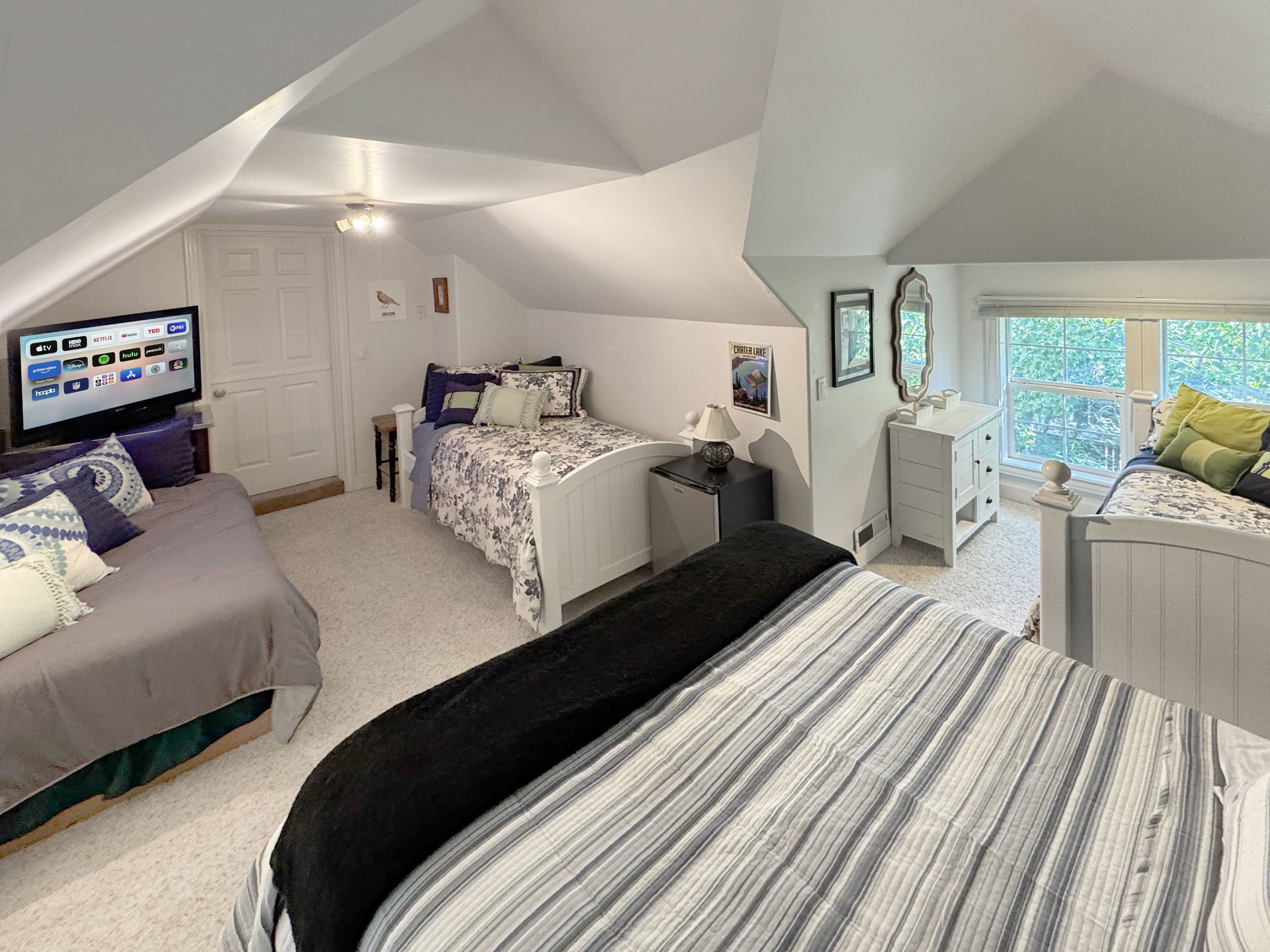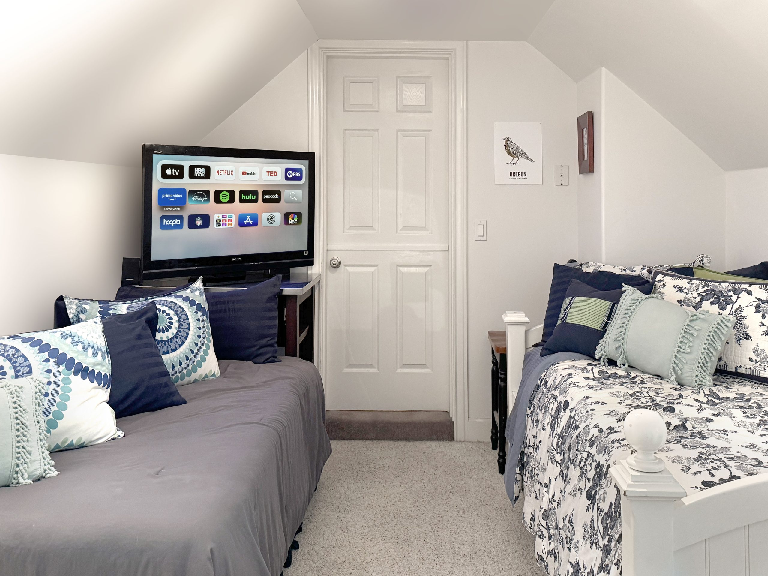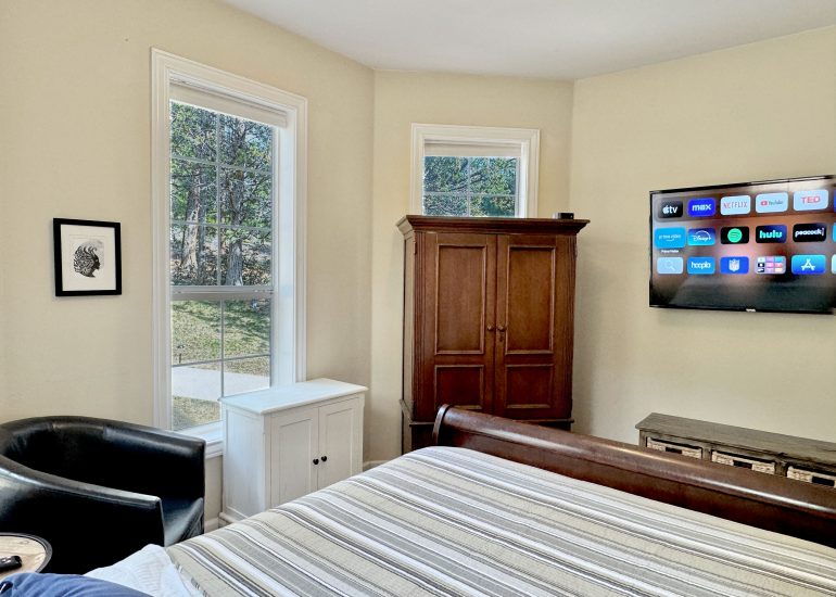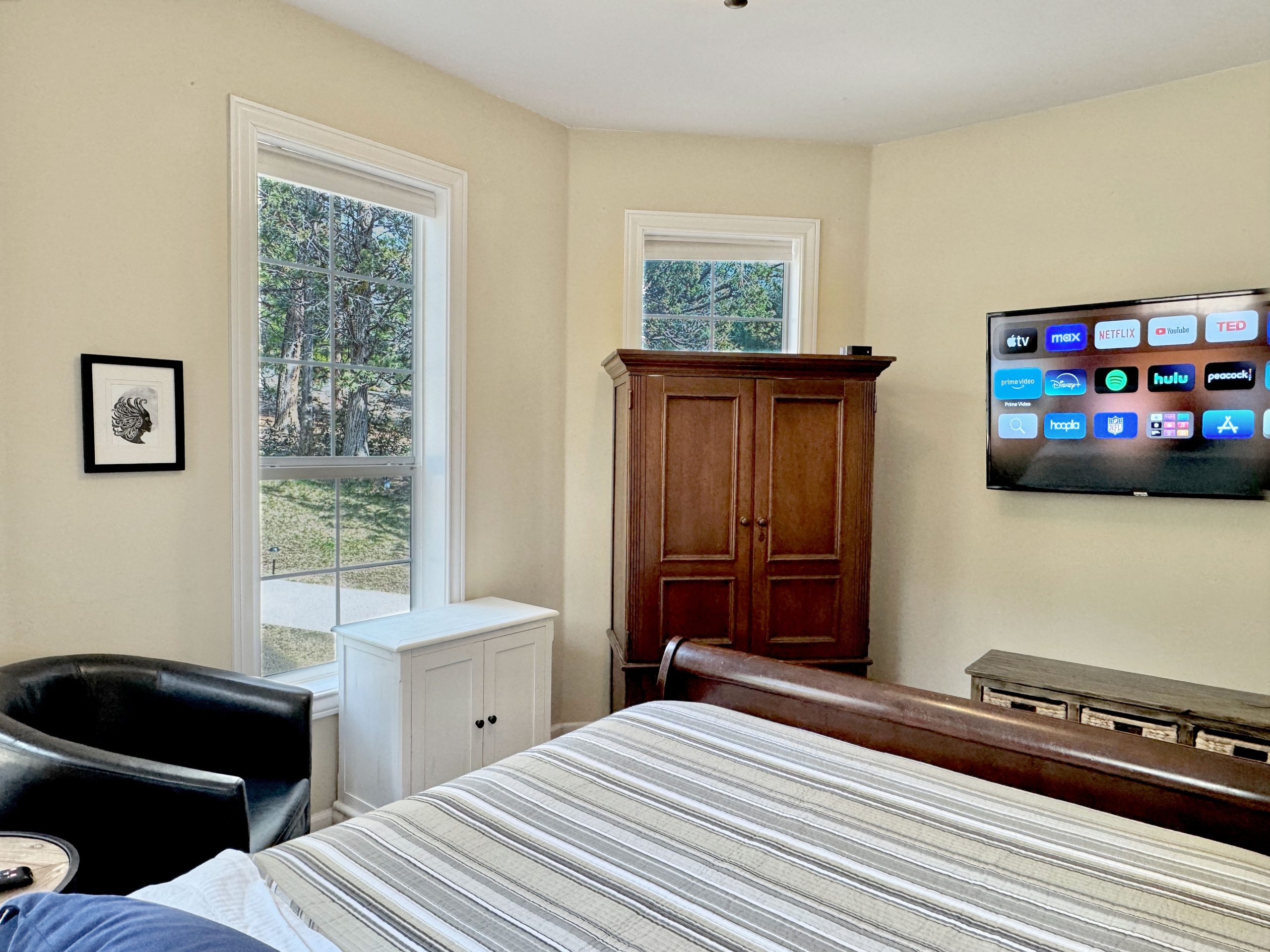 The first floor octagonal Brooklyn State Room accommodates up to 2 guests with access to a private bathroom and walls of windows to a view of 100+ year old trees, birds, squirrels and wandering resident deer. Furnished with a queen size sleigh bed, a 46" wall mounted TV w/Apple TV, a wardrobe, built-in shelving, and access to the rest of the beautiful house.