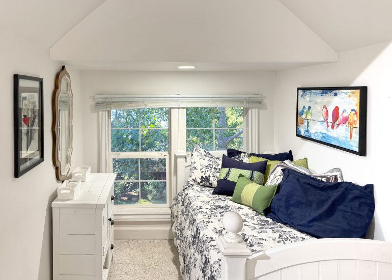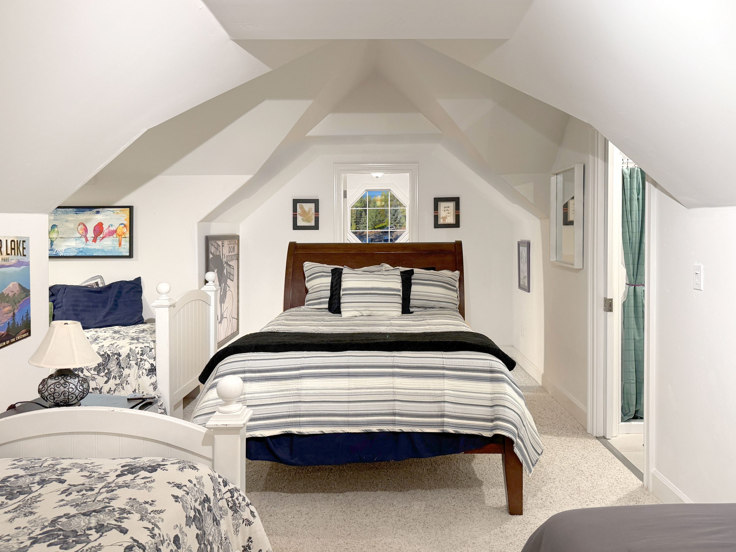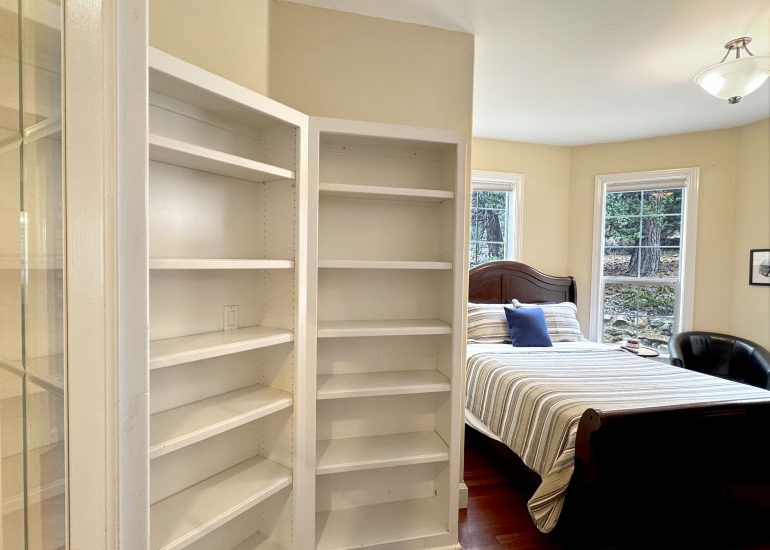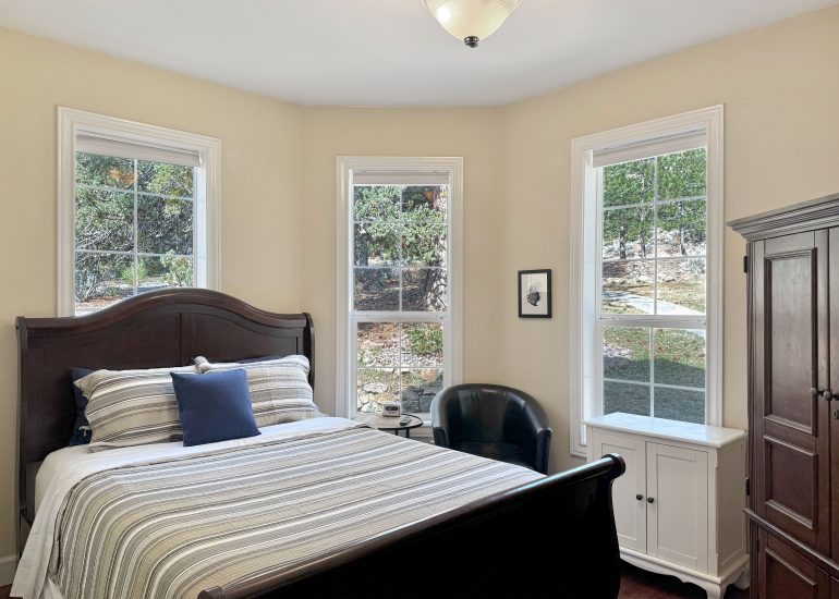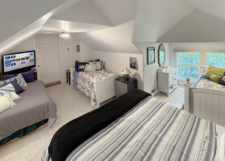 The first floor octagonal Brooklyn State Room accommodates up to 2 guests with access to a private bathroom and walls of windows to a view of 100+ year old trees, birds, squirrels and wandering resident deer. Furnished with a queen size sleigh bed, a 46" wall mounted TV w/Apple TV, a wardrobe, built-in shelving, and access to the rest of the beautiful house.