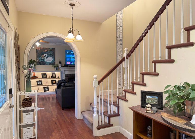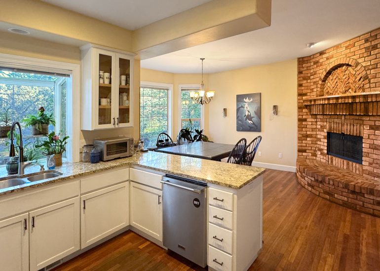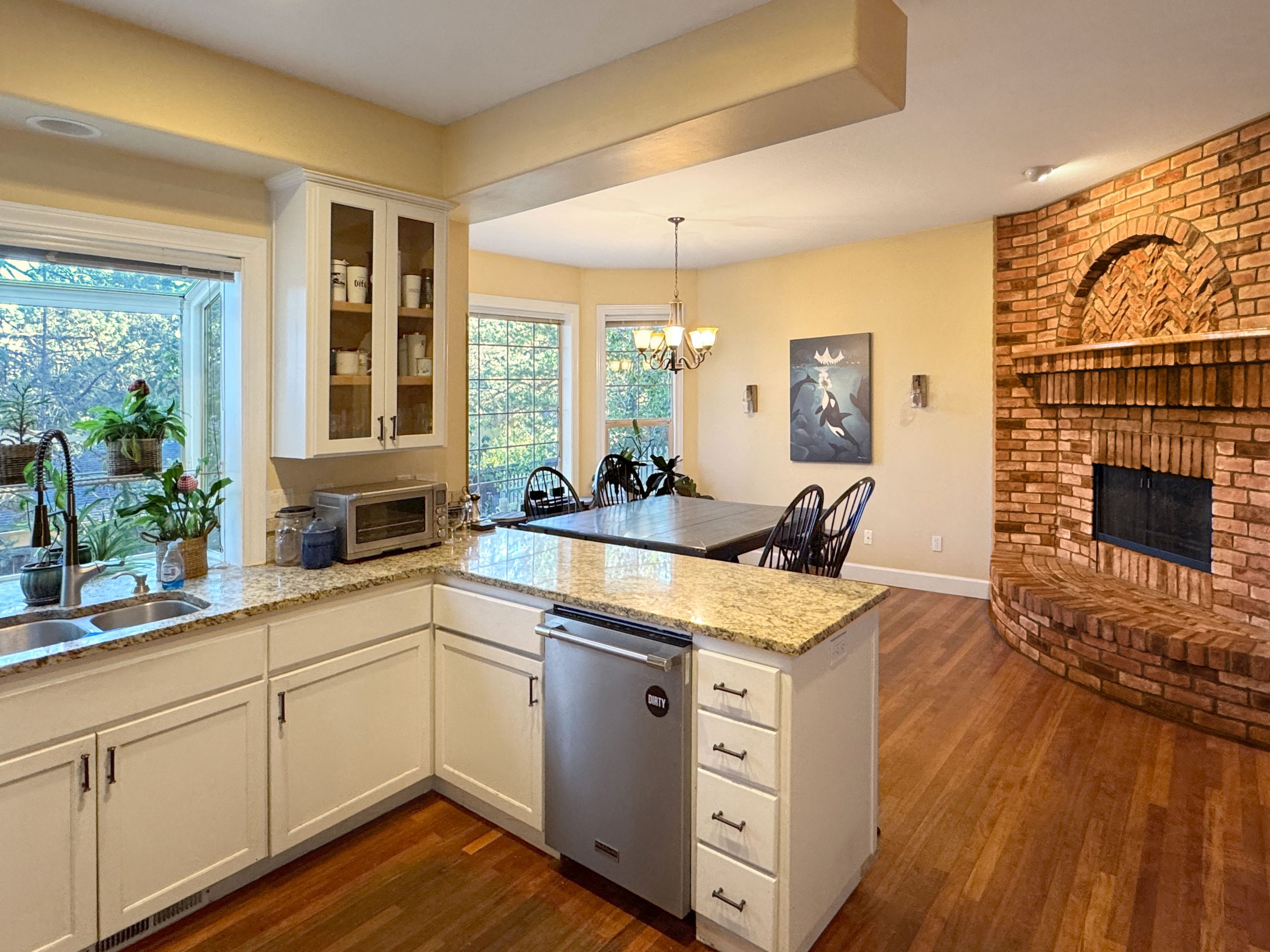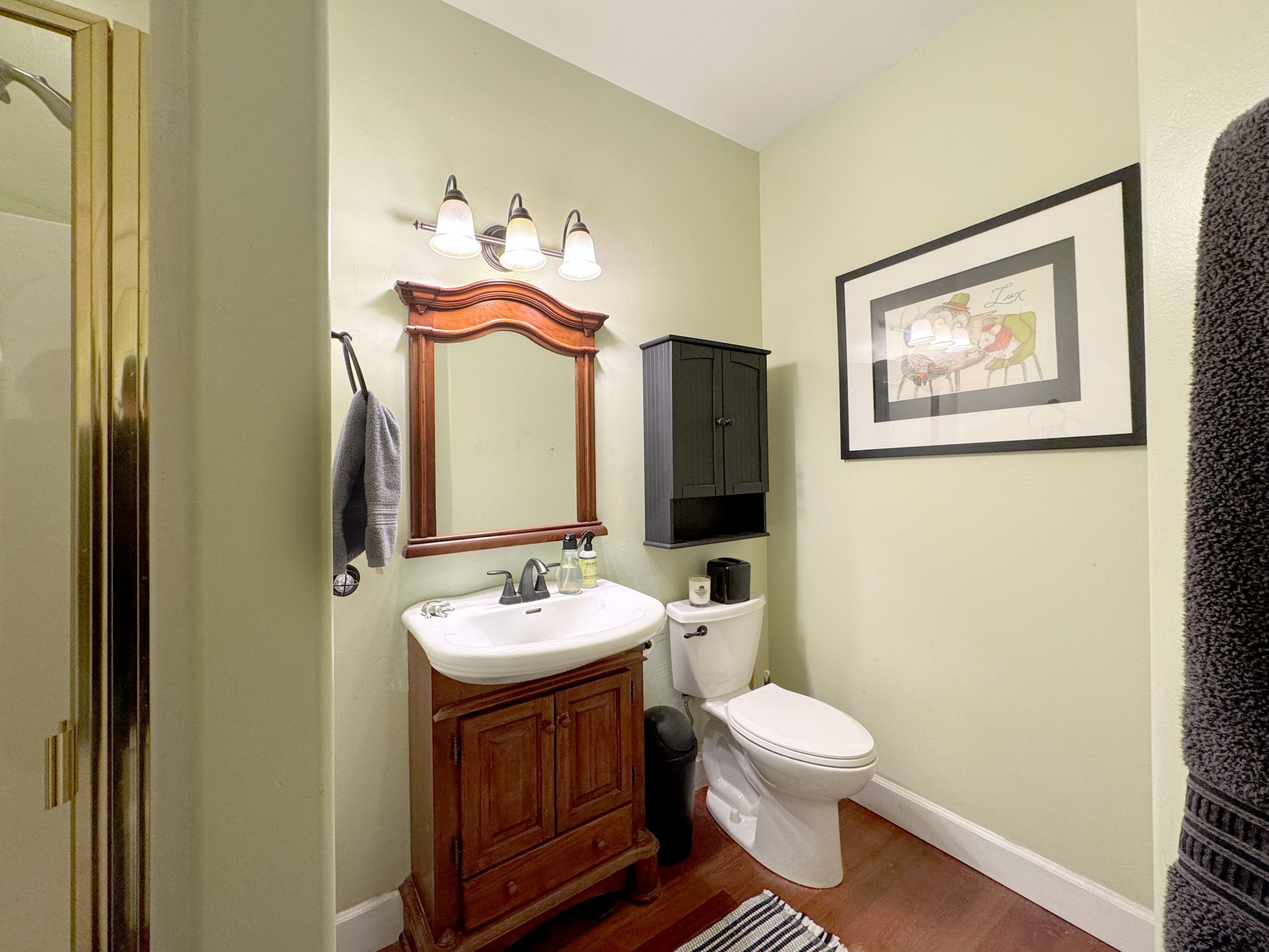 The shared space on the first floor contains rich wood floors, a brick accented full kitchen and bar, two fire places, a living room and dining area. Our appliances include a built-in oven, a built-in microwave/convection oven, a gas stovetop range, a dishwasher, a refrigerator/freezer with ice-maker, and various other smaller appliances.